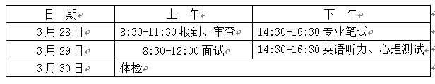 2、体检时间:3月30日上午7:00-11:30,下午:14:0-15:30,体检当天早晨须“空腹”并携带准考证、身份证、一张一寸照片。