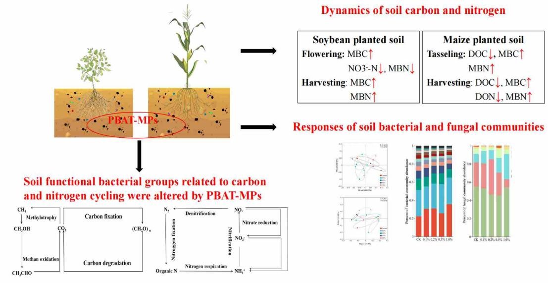 随着传统聚乙烯地膜的长期施用,农田(微)塑料污染已成为土壤健康及生态环境领域热点环境问题。可降解塑料地膜作为传统塑料地膜的替代品,可能有效解决“白色污染”问题,然而,可降解塑料对土壤健康及其生态环境效应仍存在较多争议,特别是多污染物复合作用机制尚不明确,其环境风险及生态安全等方面的科学问题亟待研究。针对上述问题及前期研究成果(Liu et al., 2025; Yang et al., 2025),团队分别开展了室内控制盆栽试验和吸附试验,评估其生态风险为其在农业生产中的应用提供参考。其中,盆栽试验以大豆和玉米为代表植物,探究了不同浓度的生物可降解己二酸/对苯二甲酸丁二醇酯微塑料(PBAT-MPs)对土壤碳氮和土壤微生物群落的影响。主要发现如下:(1)PBAT-MPs显著改变两种植物种植土壤的水溶性碳、水溶性氮和硝态氮含量,并促进土壤微生物量碳和氮的积累;(2)PBAT-MPs改变了土壤细菌和真菌群落的β多样性和群落结构,其中变形菌门相对丰度增加,酸杆菌门相对丰度减少;(3)PBAT-MPs显著影响土壤碳氮循环相关功能细菌群丰度,且这种影响具有植物种类及生长阶段的特异性。以上结果表明,可降解微塑料通过影响土壤微生物组成与代谢功能,可能调控土壤碳氮循环过程,具有潜在生态影响,且需结合植物类型进一步分析。