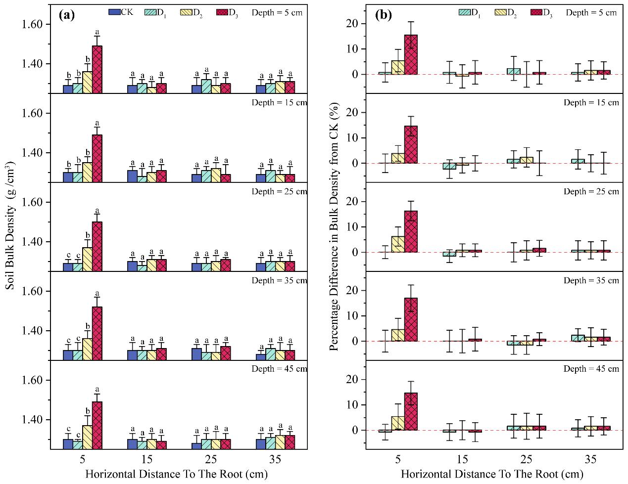 图2 (a)同根径在不同深度和径向距离下的土壤容重(g/cm³);(b) 相对于对照(CK)的容重变化百分比