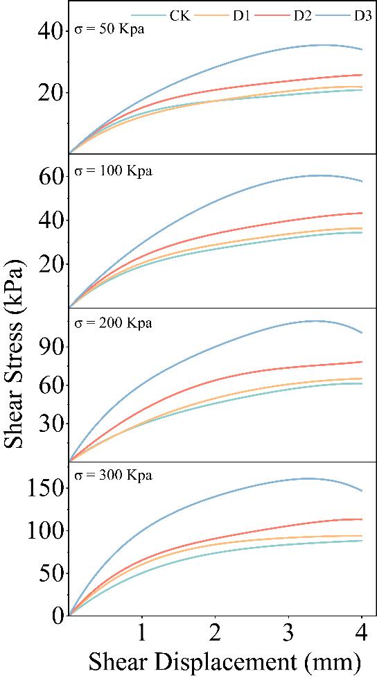 然而,研究也揭示了这一效应的双重影响:在粗根的强烈挤压下,土壤的剪切行为从塑性的“应变硬化”转变为脆性的“应变软化”,这意味着土壤在达到强度极限后更容易发生突发性破坏。这种由根系挤压形成的“紧密区”与周围疏松土壤之间的力学性质差异界面,可能成为潜在的滑动破坏面,在强降雨等极端条件下或将增加浅层滑坡的风险。