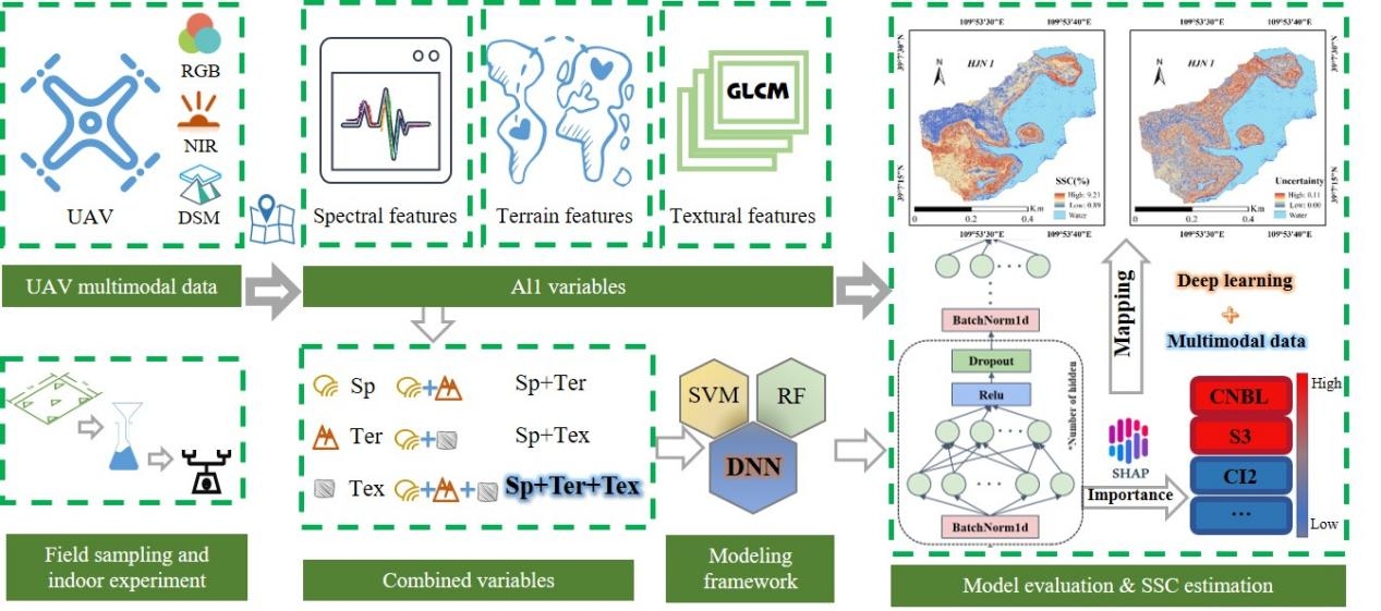 土壤盐渍化导致土地退化并降低农业生产力。由于盐渍土的高度变异性,在小流域尺度上实时、准确地监测土壤盐度仍然困难,这阻碍了我们对土壤盐渍化空间分布模式的理解。本研究探讨了无人机(UAV)获取的多模态数据和机器学习框架在典型半干旱区土壤盐度中的估算潜力。具体而言,研究从可见光和近红外光谱数据及数字表面模型(DSM)中提取信息作为模型输入,探讨了不同光谱、地形和纹理特征变量组合对土壤盐分含量(SSC)估算的影响,并比较了支持向量机(SVM)、随机森林(RF)和深度神经网络(DNN)模型在不同变量组合下的估算能力。
