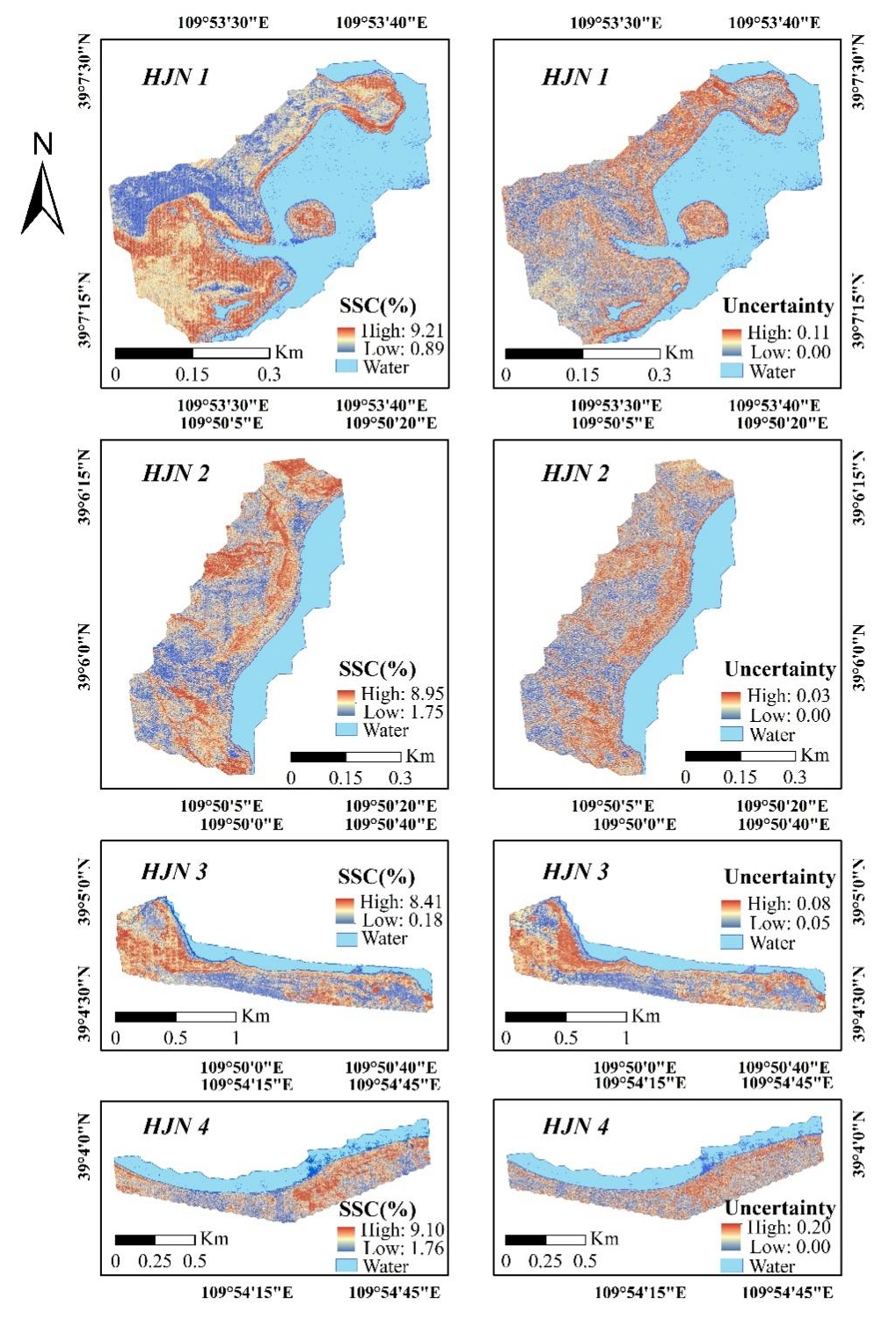 结果显示,多模态信息的融合显著提高了不同模型对SSC估算的准确性。作为辅助变量的纹理和地形特征提供了独特且互补的信息,尤其是地形变量。发现河道网络基准面(CNBL)是对SSC估算影响最大的特征。使用多模态数据融合的DNN模型在SSC估算中表现最佳,具有较低的不确定性。该模型生成的SSC估算图揭示了土壤盐渍化分布的显著空间变化,特别是在低洼地区和内流区湖岸周围。本研究为小流域尺度盐渍土监测提供了高效可行的方法与数据支撑。