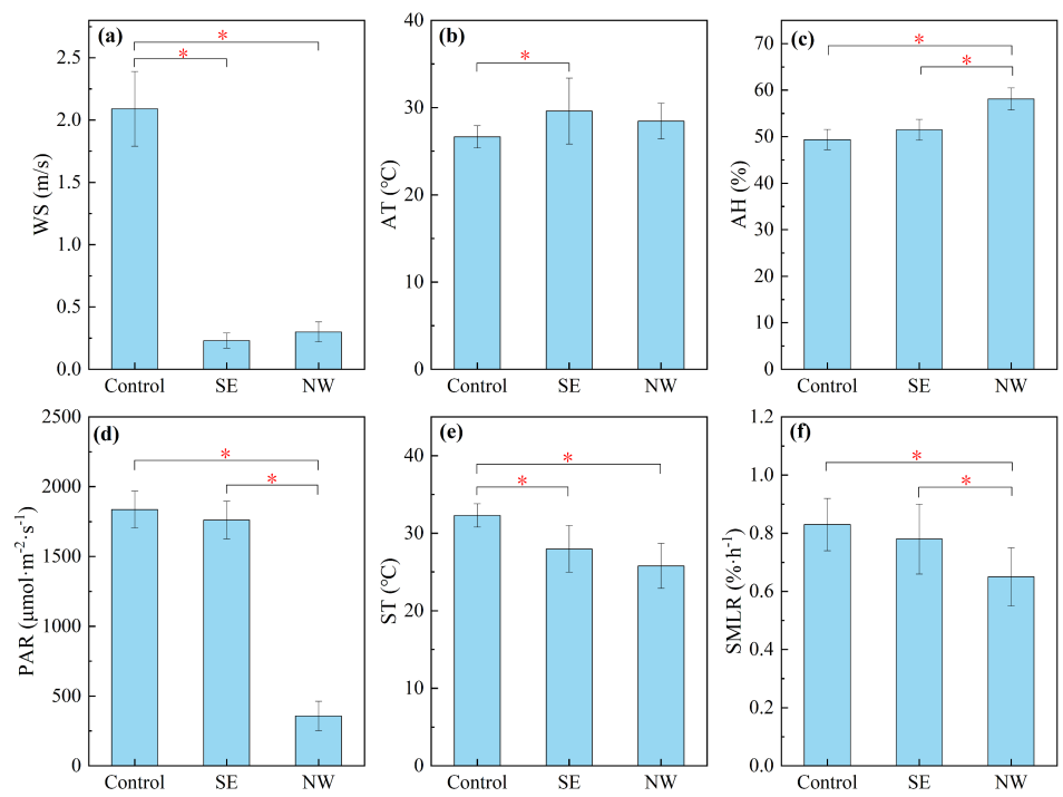 图1. 灌木冠层下不同方向的微环境差异。WS: 风速; AT: 气温; AH: 空气湿度; PAR: 光合有效辐射; ST: 土壤温度; SMLR: 土壤水分散失速率; SE: 东南方向; NW: 西北方向。