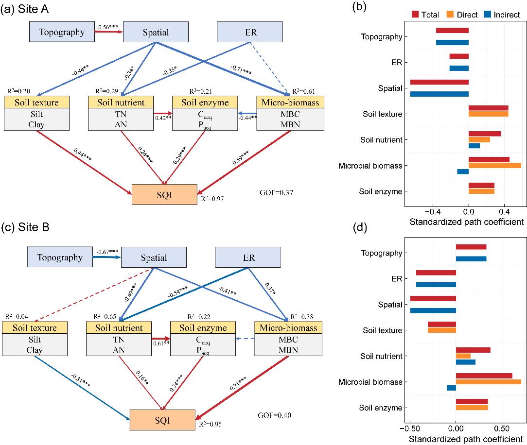 通过方差分解与结构方程模型量化了各因素的贡献,发现侵蚀、地形与空间因素共同解释了52.6%–63.0%的土壤质量变异,其中空间因素独立贡献最高达52.6%。这表明土壤质量的退化不仅由土壤侵蚀引起,更受到坡位、坡度等地形特征与空间结构的综合调控。