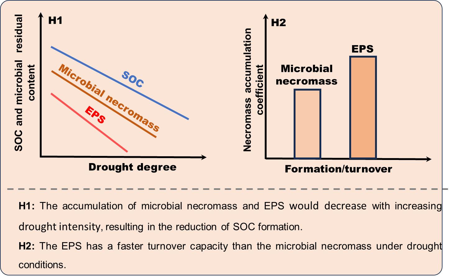尽管微生物细胞壁残体是土壤有机碳(SOC)的重要来源,但微生物在干旱胁迫下通过生理调整将碳转移到胞外聚合物的生成中,从而使其成为动态的土壤碳库。两者不同的形成和周转速率差异,在预测干旱生态系统中SOC的动态变化方面造成了根本的不确定性。长期干旱条件下胞外聚合物和微生物细胞壁残体(基于氨基糖表征)的含量、它们对 SOC 积累的相对贡献以及调节它们的因素仍然缺乏明确的机制研究。