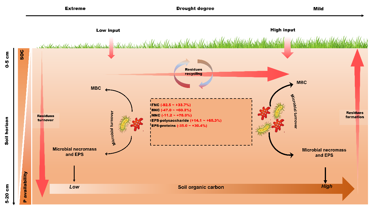 综上所述,这些发现直接证明了在维持干旱土壤有机碳库方面,胞外聚合物的贡献比微生物残体更为积极。微生物碳从残体向胞外聚合物的战略性转移,为SOC库提供了一个关键缓冲,这对理解干旱生态系统的碳循环与气候反馈具有重要意义(图4)。
