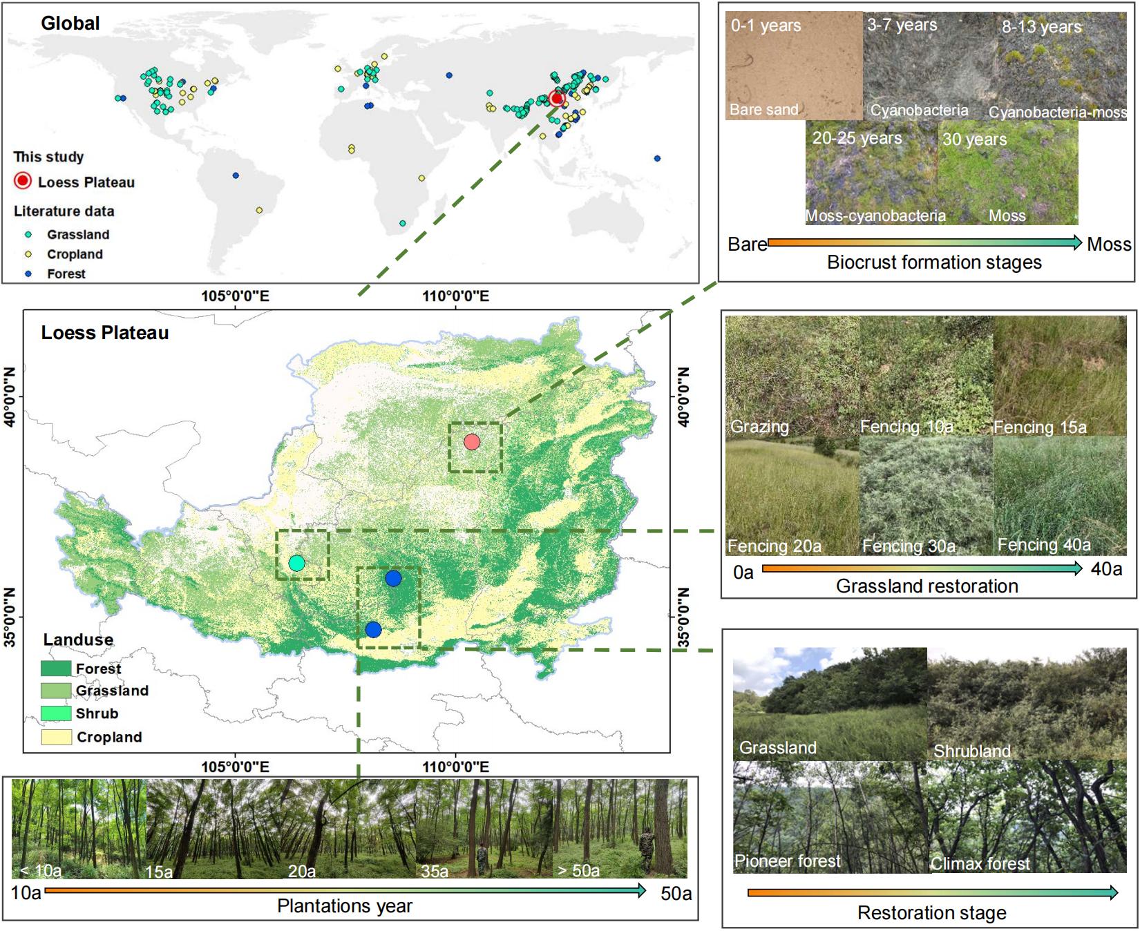 本研究基于黄土高原植被恢复区采集的768份样本(碳氮比范围6–72),并结合1600个全球数据集(碳氮比范围3.8–58),探究碳氮比对微生物残体组成和积累的调控机制(图1)。