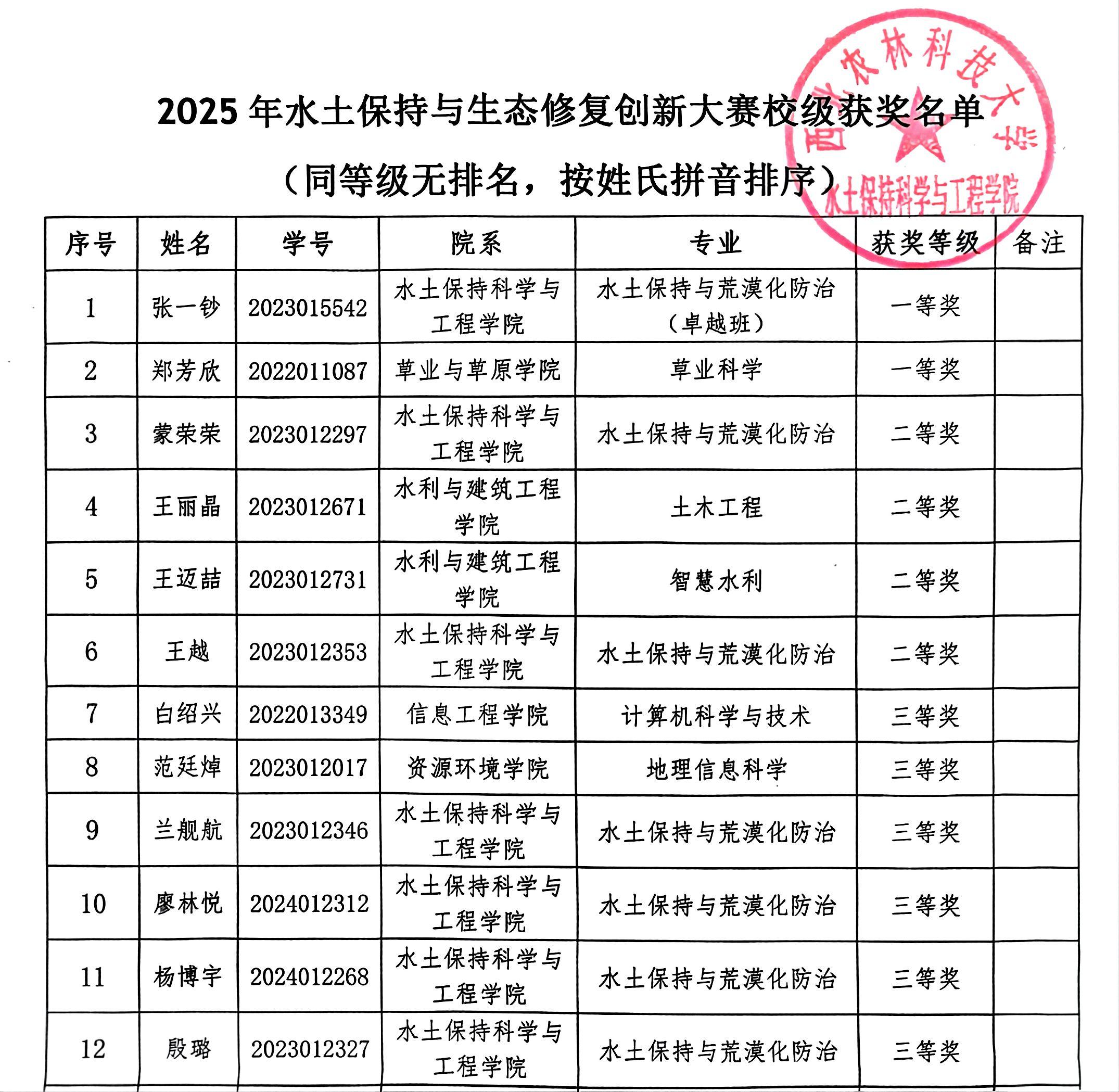 大赛严格遵循“公平、公正、公开”原则,学院组建专业专家评审团,从选题价值、创新亮点、实践可行性等多维度对参赛作品进行全面评审。最终,12名学生脱颖而出,其中一等奖2名、二等奖4名、三等奖6名。具体获奖名单如下: