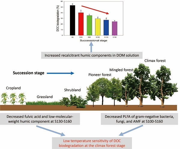 水溶性有机物(DOM)作为土壤中移动性最强和周转最快的有机质组分,在土壤碳库存储与周转、植物有效养分和土壤微生物能源供给方面扮演重要角色,其生物降解性对温室气体排放以及土壤有机质稳定性具有重要的调节作用。目前,科学界关于水溶性有机物生物降解过程及其温度敏感性对植被自然恢复的响应机制尚不清楚。该研究通过微生物降解培养试验,探究了水溶性有机物生物降解性对三个温度水平(4℃,20℃,35℃)的响应规律,研究表明DOM生物降解性随黄土高原植被自然演替显著降低,温度升高通过提高微生物对水溶性有机物中惰性腐殖质成分的利用效率促进水溶性有机碳的生物降解,水溶性有机物的富里酸和小分子腐殖质成分在植被自然恢复130至160年显著降低,微生物磷脂脂肪酸含量在植被自然恢复100至160年显著增加,N-乙酰氨基-β-葡萄糖苷酶和磷酸酶的温度敏感性在植被演替森林阶段保持低水平。上述因素的共同作用促使DOM生物降解的温度敏感性在森林顶级群落阶段达到最低。本研究首次发现随着植被演替恢复,DOM的生物降解能力逐渐降低,并对温度变化的承受能力不断增加,进而促进了水溶性有机物含量的积累。该研究深入揭示了水溶性有机物生物降解性及其温度敏感性的作用机制,为黄土高原土壤有机质的稳定维持途径提供了理论依据。