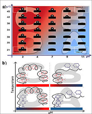 A 双响应材料在温度、pH值控制下超疏水与超亲水转变 B 薄膜对于温度/pH值响应的机理。