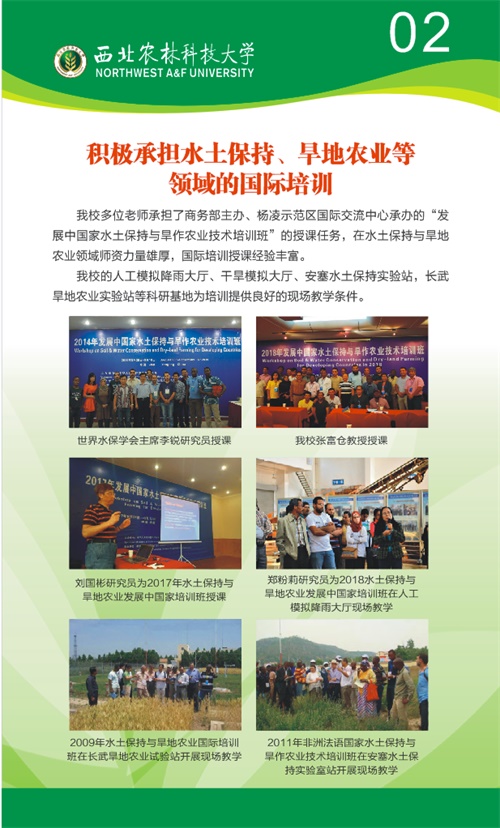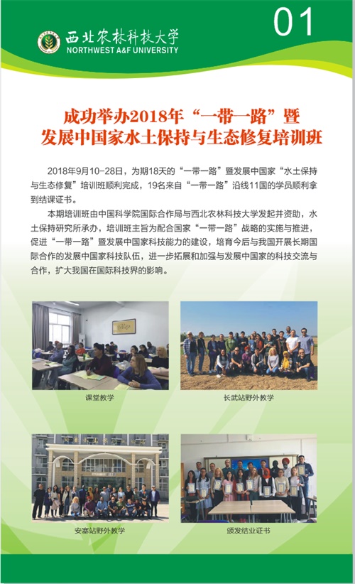 合作成果展充分展示了水土保持研究所自2013年以来,响应“一带一路”倡议开展的聚焦水土保持、节水灌溉和旱地农业等对外交流合作以及培训成果。水保所的有关专家包括世界水土保持学会主席李锐研究员、中国水土保持学会副理事长刘国彬研究员、中美水土保持研究中心主任郑粉莉研究员、国际荒漠化协会(DNI)联合主席王飞研究员等专家多次为学员授课、带领学员野外实习培训。倡议提出“全球土壤侵蚀研究计划”,举办全球土壤侵蚀研究高层论坛,与上合组织国家合作积极开展泛第三极土壤侵蚀定量评价与分区防控对策研究。成功举办2018年“一带一路”暨发展中国家水土保持与生态修复培训班,进一步拓展和加强与发展中国家的科技交流与合作。承担“中非水行动计划”、“黑土侵蚀防治机理与调控技术”、“尼罗河上游丘陵区水土保持与农业高产高效”、“中欧合作项目Horizon 2020”、“中国黄土高原和南非典型流域泥沙来源及调控对策”等一批重大国际合作交流项目。同时,国家节水中心和旱区节水农业研究院、安塞水土保持试验站、长武旱地农业试验站、人工模拟降雨大厅、人工模拟干旱大厅等科学研究试验和培训基地为对外培训和技术交流提供了良好的现场教学实习条件。