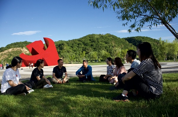 南泥湾党徽前合影