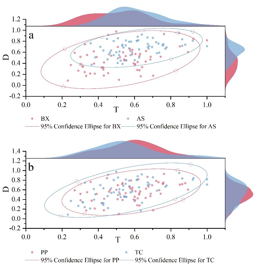 图1 沟头活跃性评估框架。a) 宾县(东北黑土区)与安塞(黄土高原区)沟头T–D分布;b) 张裂隙破坏主导型沟头与跌水冲刷主导型沟头T–D分布