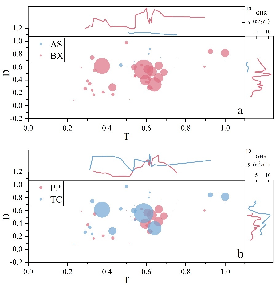 图2 沟头面积扩张速率(GHR)和T,D的关系,点大小表示沟头活跃性大小。a) 宾县(东北黑土区)与安塞(黄土高原区)沟头活跃性与GHR;b) 张裂隙破坏主导型沟头与跌水冲刷主导型沟头活跃性与GHR