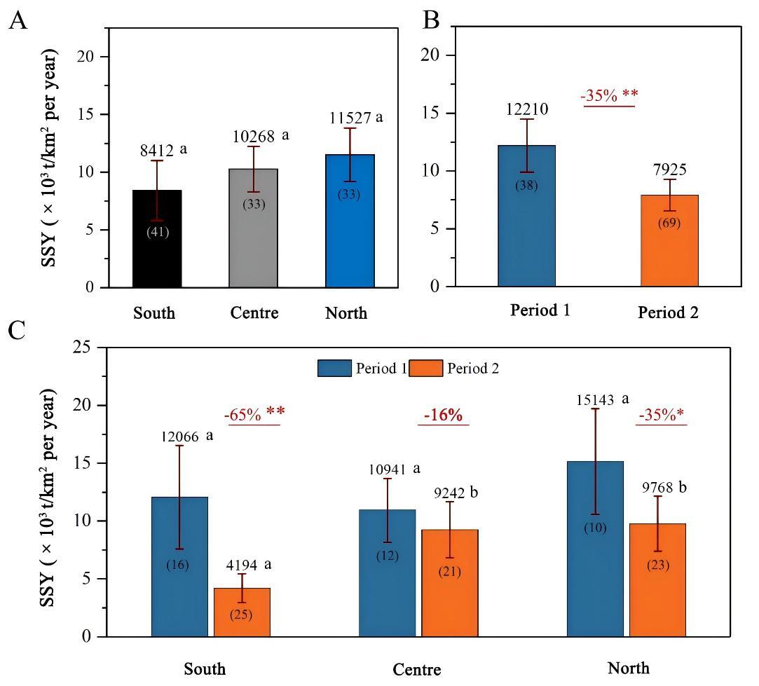 以1999年退耕还林工程实施为界,小流域产沙模数发生了显著变化(图4)。工程实施后,产沙模数下降了16%-65%,其中降雨较充沛的南部区域降幅最大。进一步分析表明,沟道产沙的减少是全流域产沙下降的主要原因,其对SSY总减少量的贡献率高达88%。这一结果揭示了沟道侵蚀控制在流域减沙中的决定性作用。