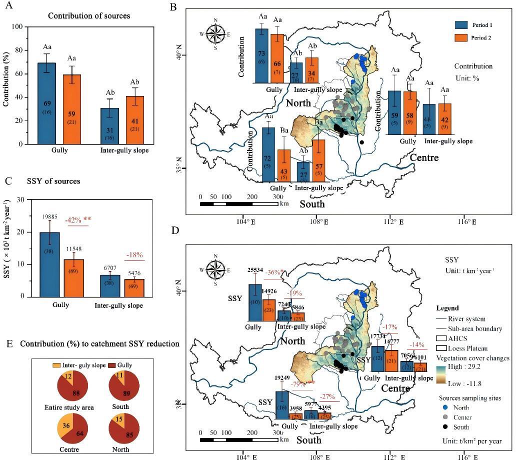 研究发现,近几十年来黄土高原小流域年均产沙模数(SSY)空间差异显著,变化范围为498-28,460 t/km2·a(图2)。在泥沙来源方面,沟道(包括沟床、沟坡及沟岸扩张)始终是主要的泥沙来源,其对流域总产沙量的平均贡献率约为64%,显著高于沟间地坡面(图3)。