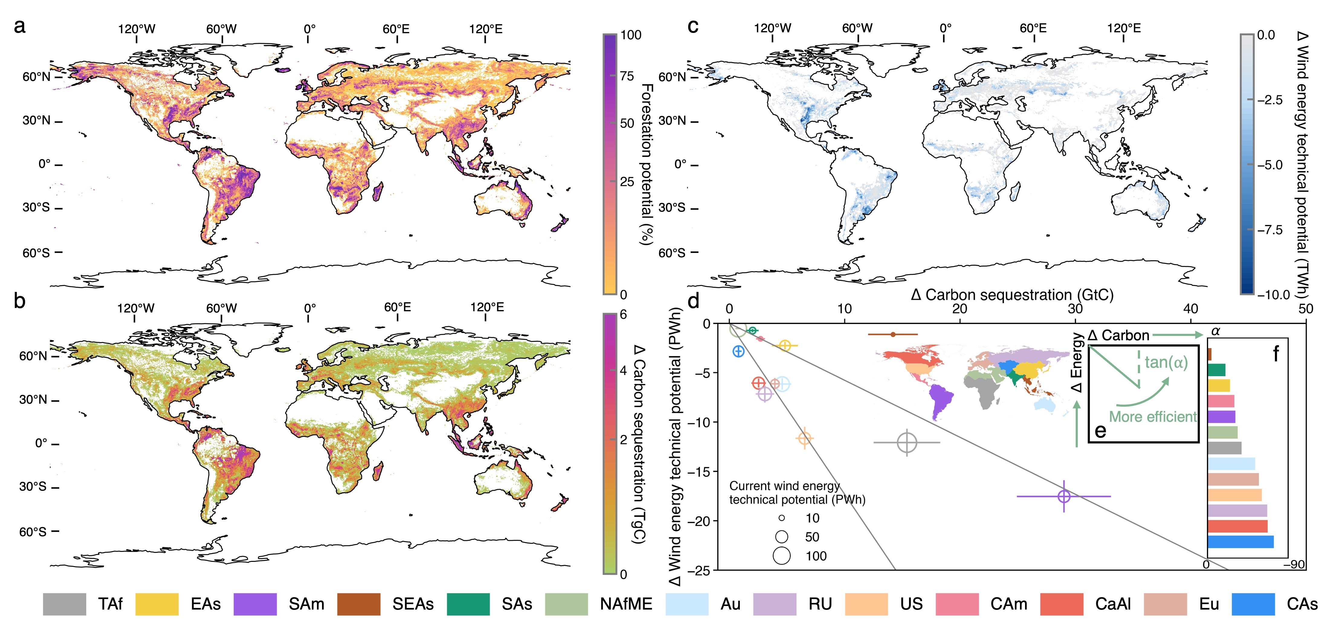 图1 基于生物量碳汇-风能技术潜力权衡关系的区域植树造林优先级排序。(a) 全球植树造林潜力;(b) 植树造林引起的生物量碳汇潜力;(c) 植树造林引起的风能技术潜力损失;(d) 不同区域风能技术潜力与生物量碳汇潜力之间的权衡关系;(e) 区域造林效率的计算方法示意图;(f) 各区域造林效率排序。