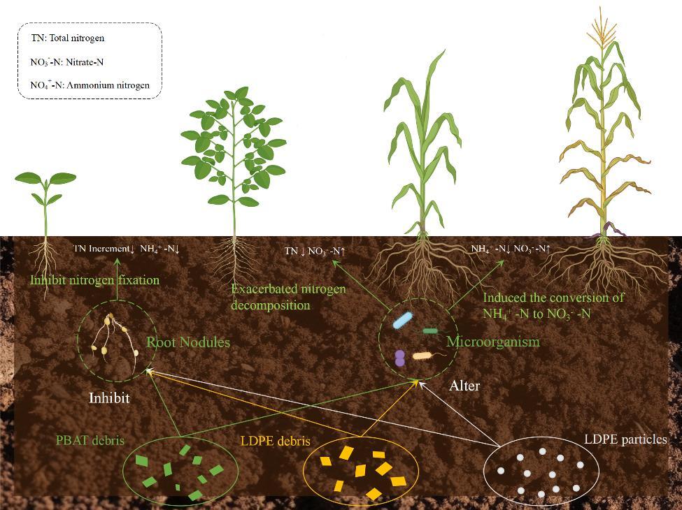 本研究基于团队前期工作基础(Jia et al., 2024; Liu et al., 2025),聚焦大豆-玉米轮作系统中低密度聚乙烯碎片(LDPE-D)、生物可降解己二酸/对苯二甲酸丁二醇酯碎片(PBAT-D)以及低密度聚乙烯颗粒(LDPE-P)对土壤氮生物有效性的影响。研究发现:(1)在未受微塑料污染的条件下,大豆-玉米轮作能够维持并提升土壤氮水平;而在微塑料污染条件下,PBAT-D、LDPE-D 和 LDPE-P 均显著抑制大豆生长期土壤全氮的增加,并加剧休耕期土壤全氮下降,导致轮作结束后土壤全氮水平下降(即氮损失);(2)PBAT-D 和 LDPE-D 在大豆生长期显著抑制土壤铵态氮增加,而微塑料污染处理均显著促进休耕期土壤硝态氮累积,并在玉米生长期促进铵态氮向硝态氮转化;(3)微塑料处理可显著抑制大豆和玉米根际土壤中亮氨酸氨基肽酶和丙氨酸氨基转移酶活性,同时对 N-乙酰-β-葡萄糖苷酶活性产生差异化影响。