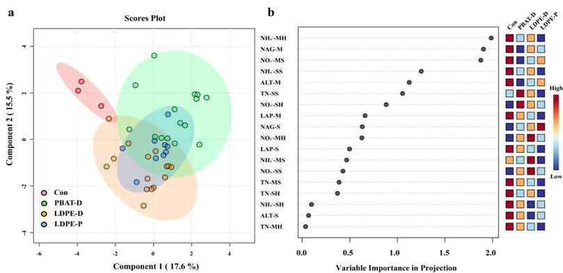 综合分析表明:不同微塑料处理与对照之间存在显著差异,其中大豆期和玉米期的无机氮指标以及部分根际酶活性是区分不同处理的关键因子。研究发现:微塑料污染可能改变土壤氮素转化路径,增强速效氮淋失风险,从而削弱轮作体系的氮素积累能力,对农田氮素保持和利用效率产生不利影响。