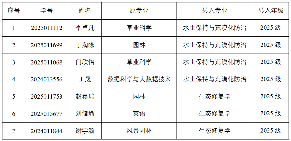 根据学校《关于开展2025-2026学年本科生转专业工作的通知》要求、依据《西北农林科技大学本科生转专业实施办法》(校教发〔2025〕256号)及《水土保持科学与工程学院本科生转专业考核办法》,经学生申请、转出学院同意、学院考核等程序,现将2026年转专业拟录取名单公示如下: